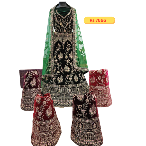 This image showcases a luxury heavy embroidered lehenga choli set with rich traditional craftsmanship. The main display lehenga features a deep black velvet base adorned with intricate zari, resham, and sequin embroidery in floral and ethnic motifs. The set is paired with a matching embroidered blouse and a contrast green dupatta with elegant printed and bordered detailing.