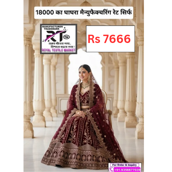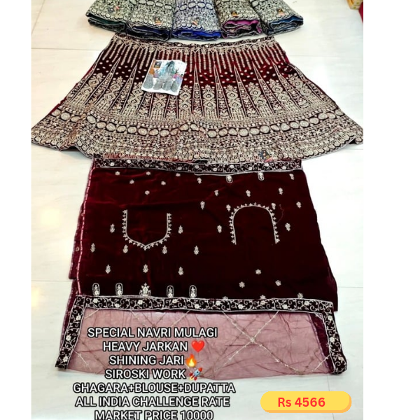 Multiple lehenga pieces in royal colors (maroon, red, wine, and black shades) are displayed around, highlighting the variety available in the same premium pattern.